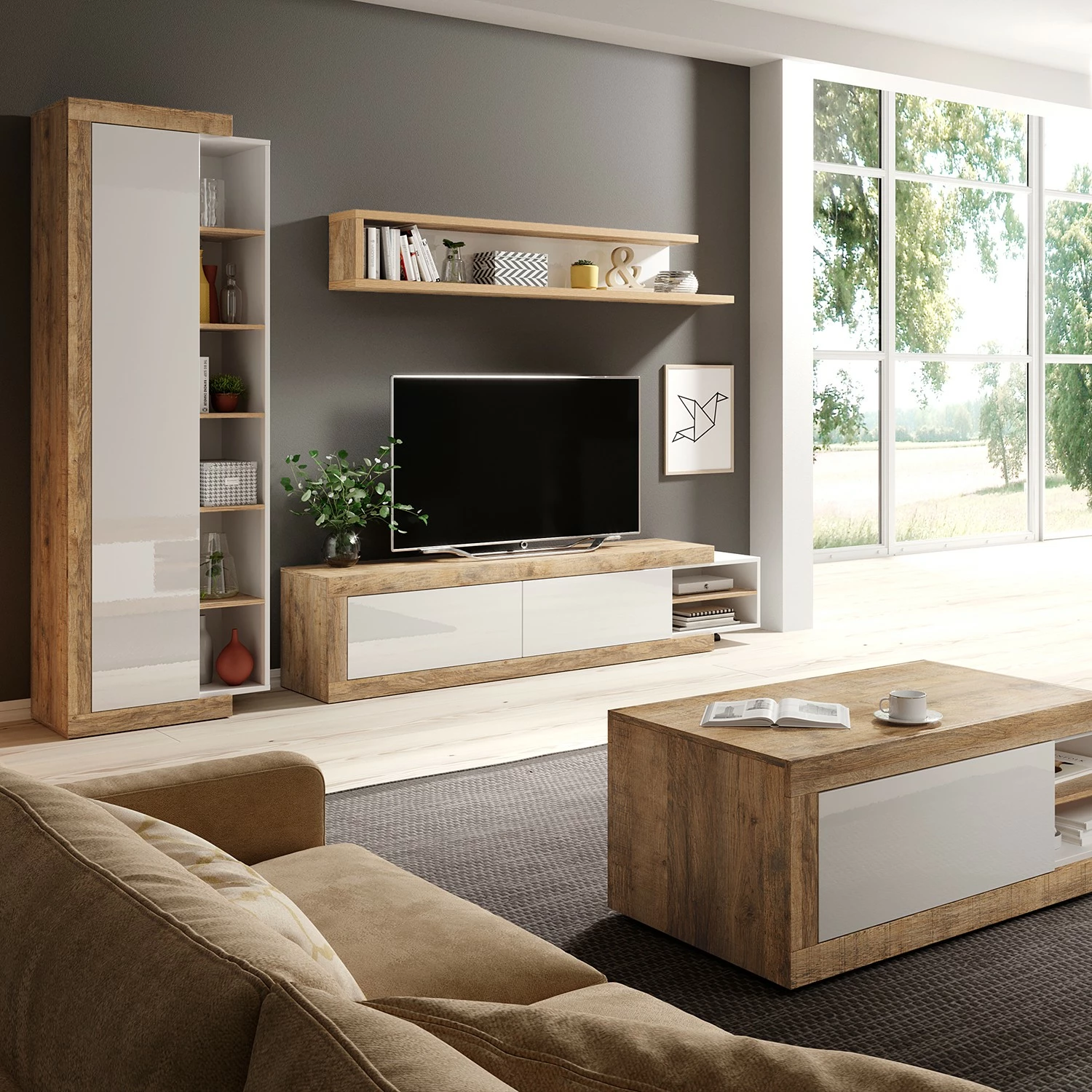 - Hochglanz Weiß / Eiche Dekor