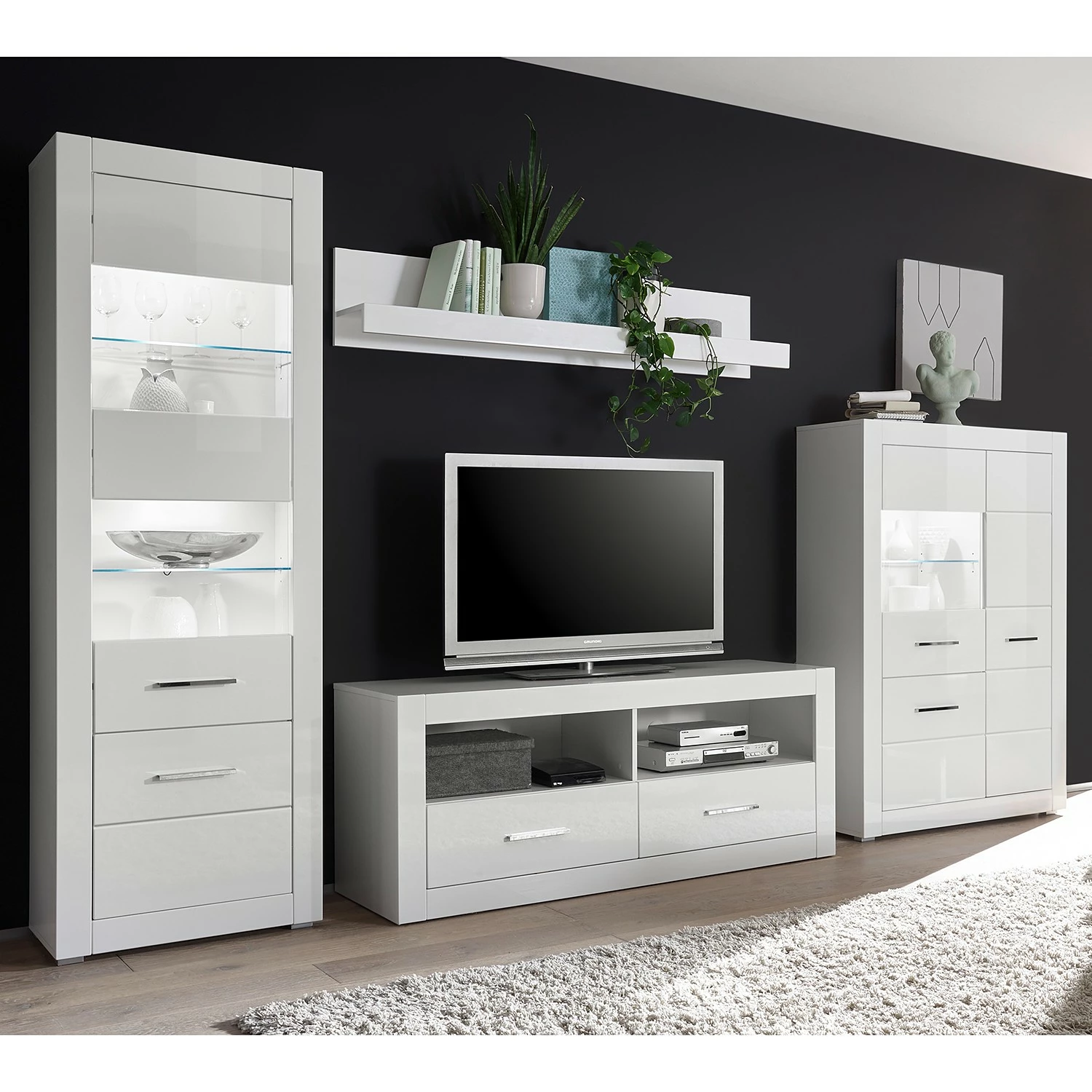 - Lieferumfang: Wohnwand bestehend aus 1 Vitrine, 1 Wandboard, 1 Lowboard & 1 Highboard ohne Beleuchtung & Dekoration