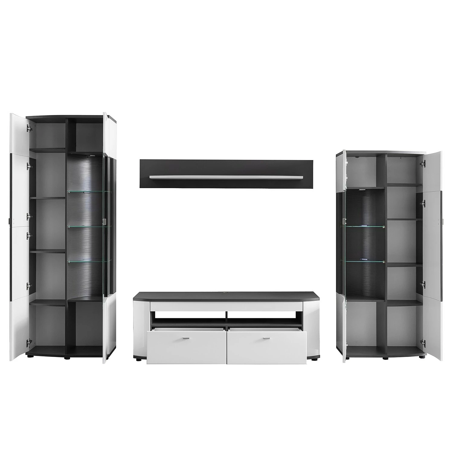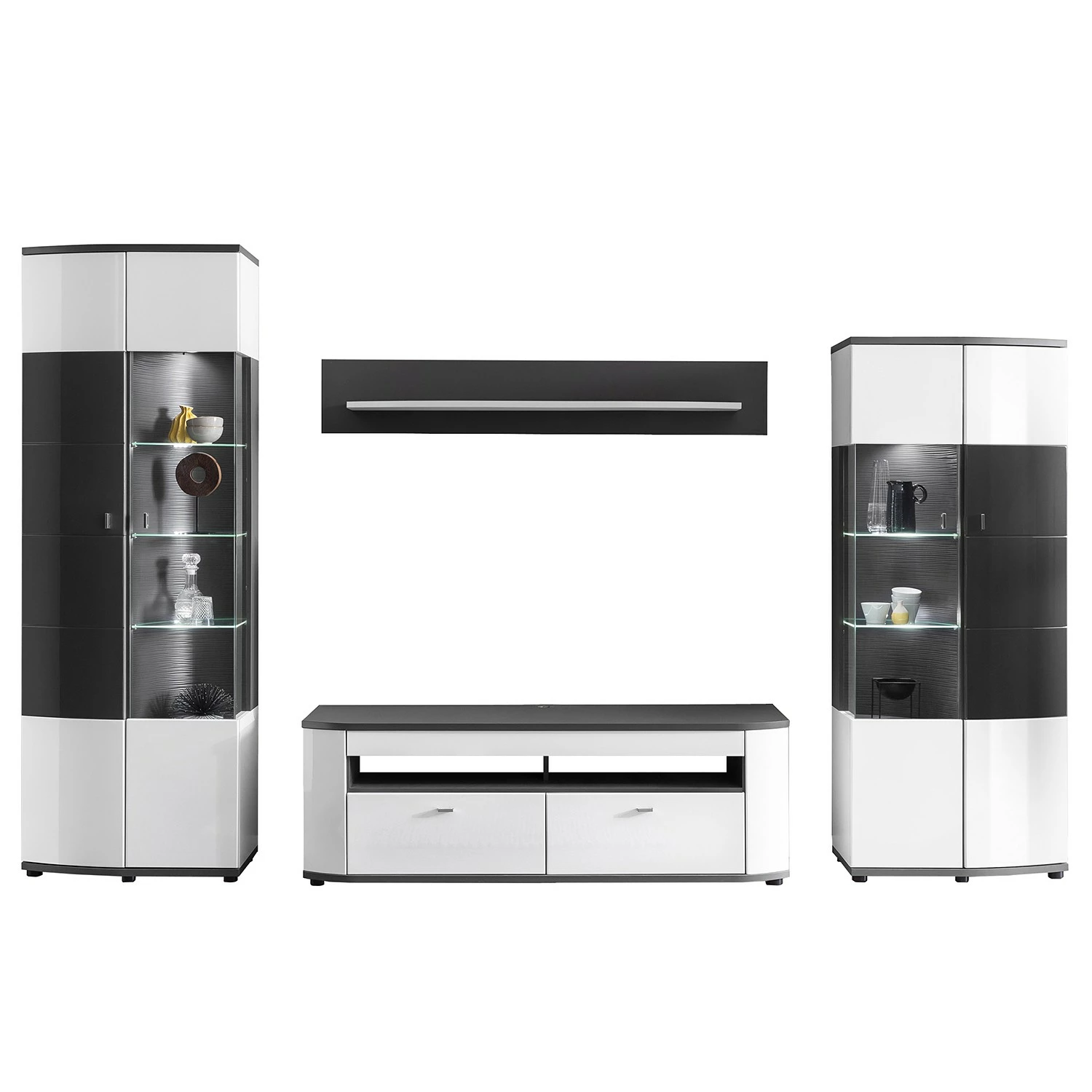 - Lieferumfang: Wohnwand bestehend aus 1 Lowboard, 2 Vitrinen & 1 Wandboard ohne Beleuchtung & Dekoration