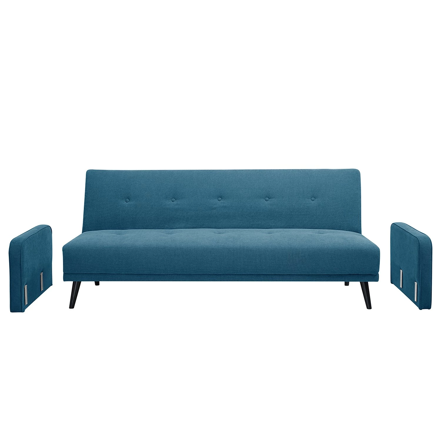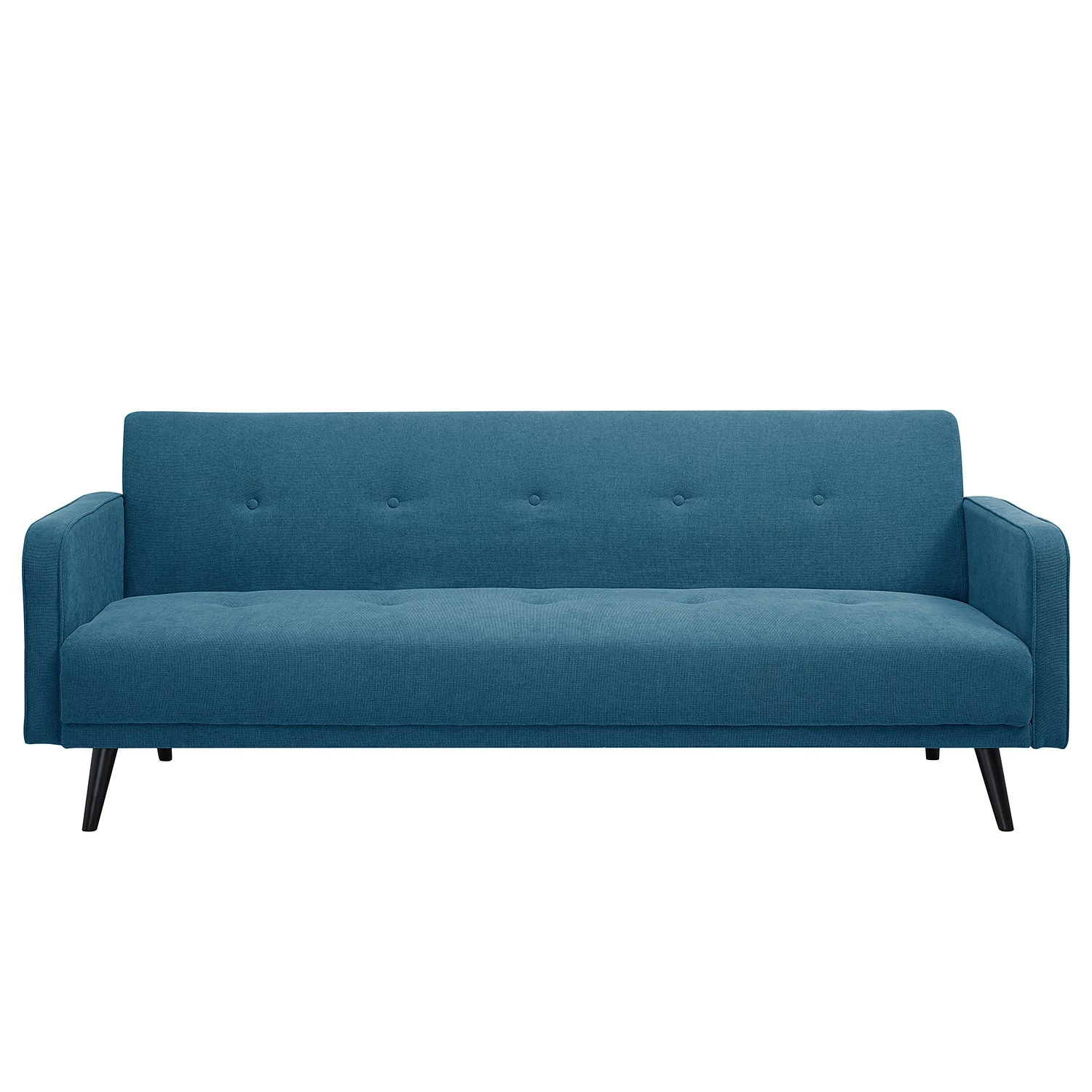 Das Schlafsofa Daru aus dem Hause Mørteens ist ein gemütliches Möbel im angesagten Retrodesign. Besonders die Knopfleiste auf der Rückenlehne des Sofas fällt dem Betrachter ins Auge. Durch abgerundete Armlehnen und einen abgeschrägten Rückenbereich lädt das Schlafsofa Daru zum Verweilen ein. Für einen angenehmen Sitzkomfort sorgt die stufenweise Verstellbarkeit der Rückenlehnen, welche durch einfaches Umklappen eine Liegefläche für zwei Personen hergeben. Das Schlafsofa ist mit hochwertigem Polyurethanschaumstoff gepolstert und besitzt ein stabiles Holzgrundgestell. Der Rundumbezug des Schlafsofas Daru aus 100 % Polyester macht das Möbelstück aus jedem Blickwinkel zu einem echten Hingucker. Bei Verschmutzungen sollte das Produkt mit einem feuchten Baumwolltuch gesäubert werden.
