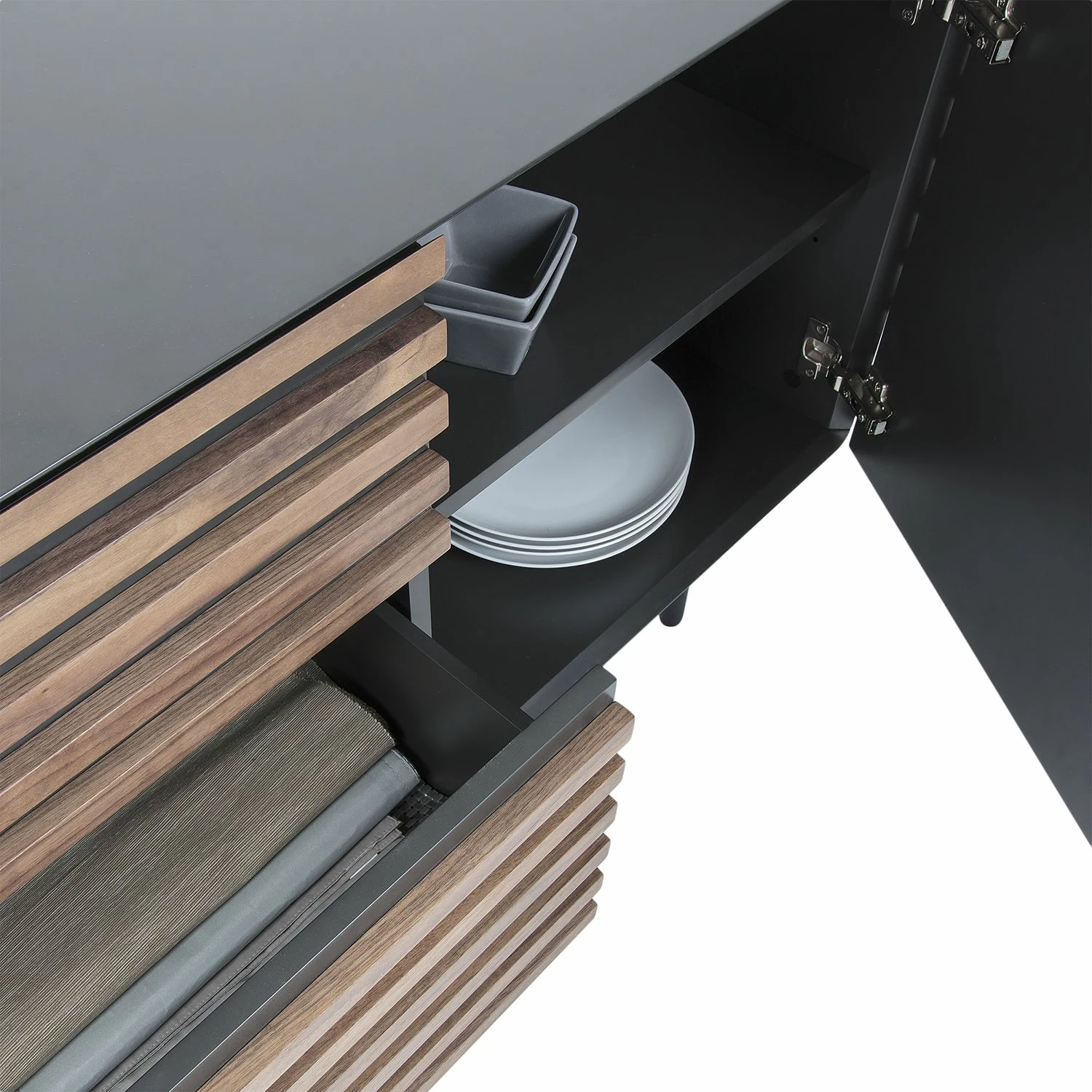 - Front: MDF (Mitteldichte Holzfaserplatte), furniert