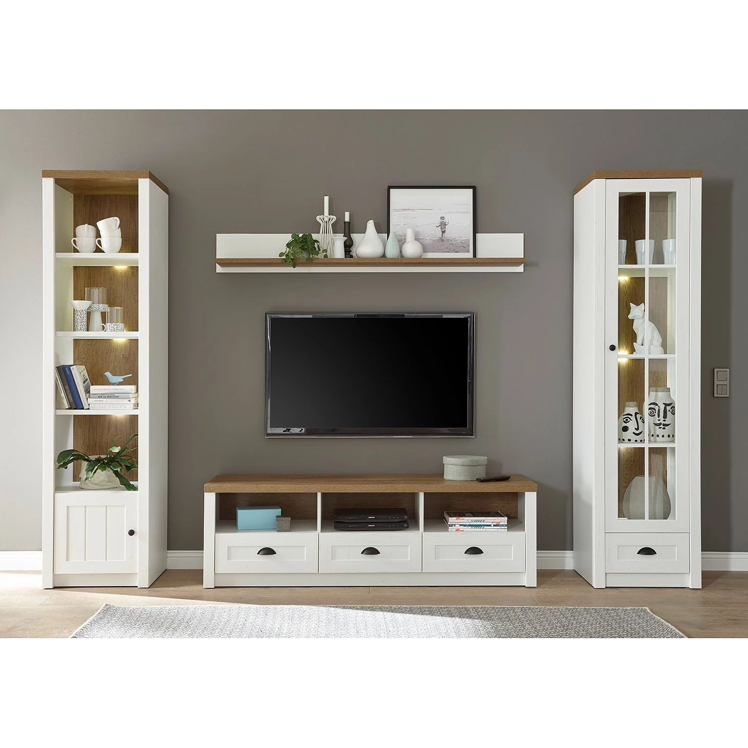 - Lieferumfang: 1 Vitrine, 1 Wandboard, 1 Lowboard & 1 Regal ohne Beleuchtung & Dekoration
